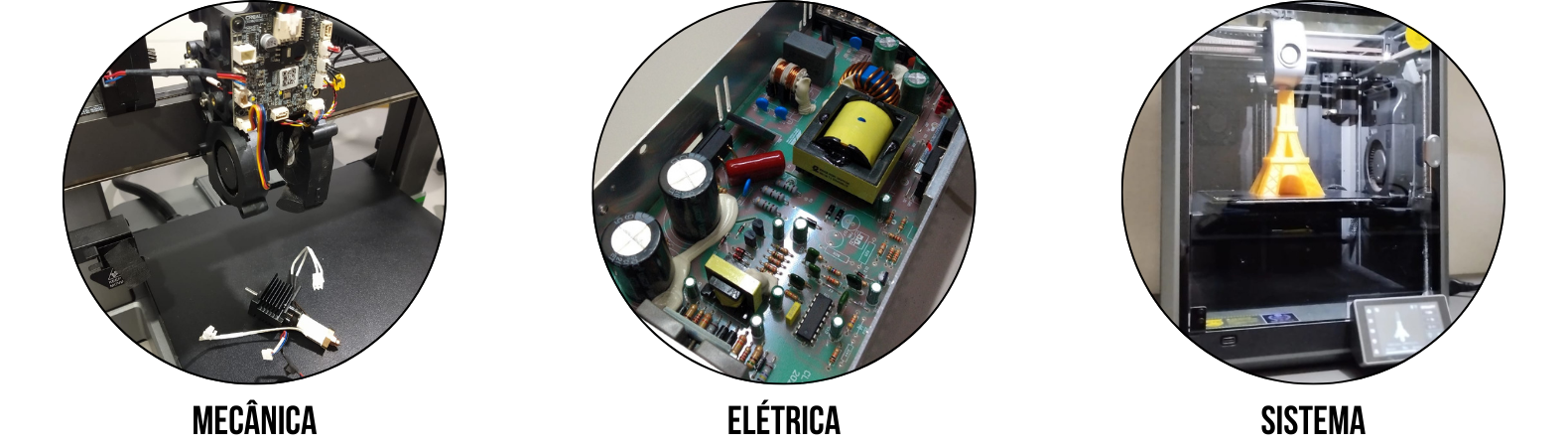 Todos os módulos são 100% práticos. Os participantes terão acesso a diferentes modelos de impressoras 3D, ferramentas técnicas, componentes e equipamentos reais para análise, diagnóstico e observação.